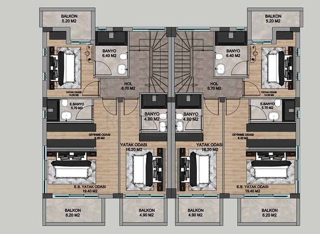 Кожна вілла спроектована за плануванням 4 + 1 і має загальну площу 320 м2, включаючи простору вітальню, окрему кухню, 4 спальні і кілька ванних кімнат.
