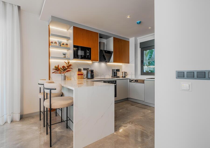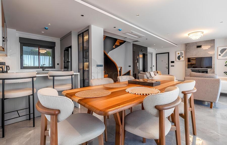 Вілла включає простору вітальню, окрему кухню з гранітною робочою поверхнею, три спальні, дві ванні кімнати з душовими кабінами і три санвузли. Додатковою перевагою є тераса і балкон, що створюють зручні зони для відпочинку. Вілла повністю мебльована і оснащена побутовою технікою, встановлені кондиціонери і система теплої підлоги, підлогове покриття виконано з якісної плитки, інтер'єр оформлений в світлих нейтральних тонах.